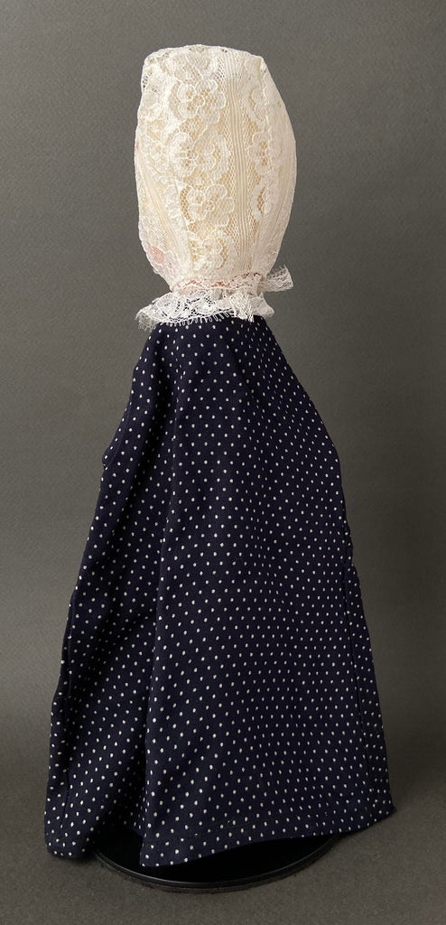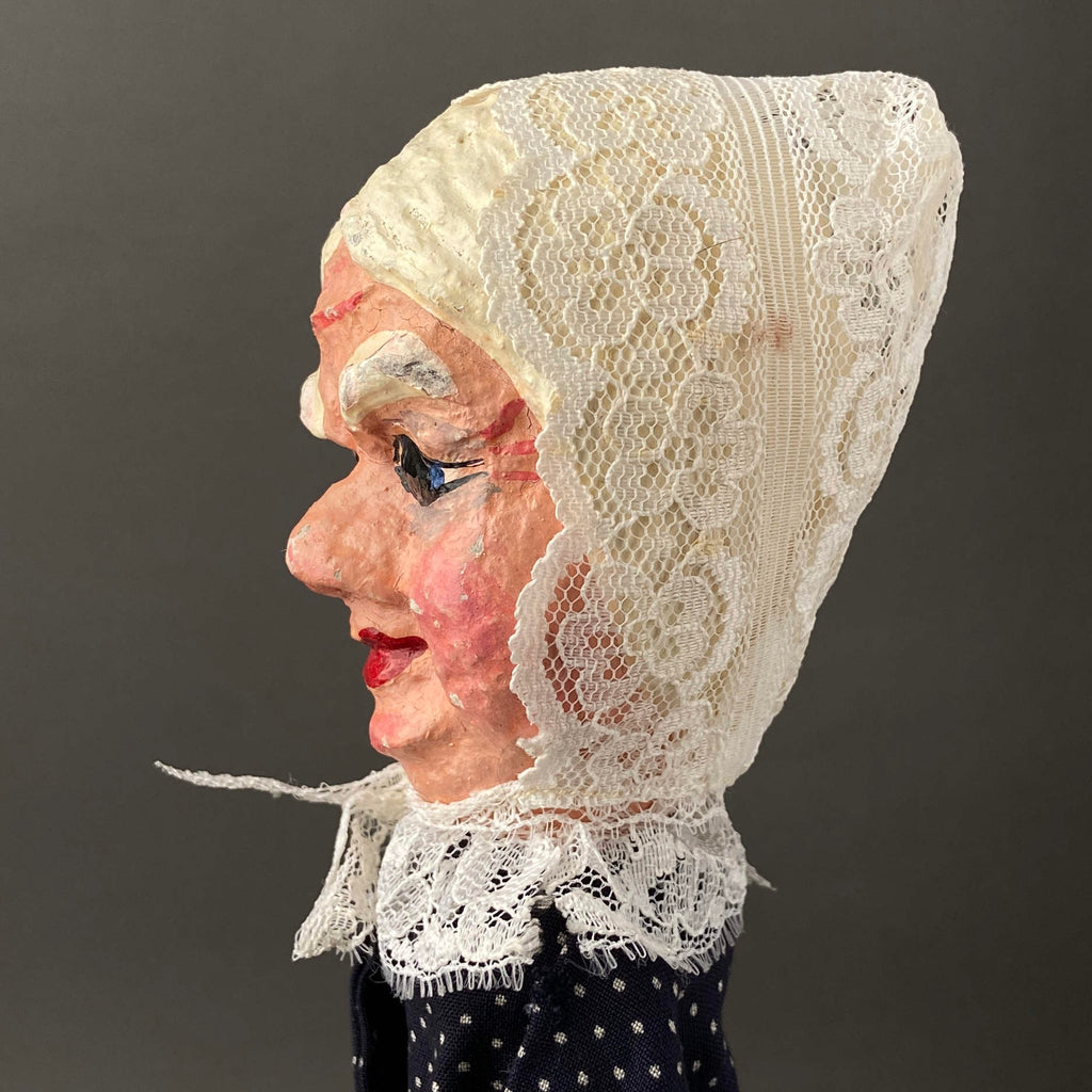 Here's a vintage GRANDMOTHER Hand Puppet full of personality. This toy comes from a set of papier mâché hand puppets crafted in Germany circa 1960s. It features a carefully hand painted head with lovely fabric costume. Grandmother is about 12.5 inches (32cm) tall and was likely made for children's play. This puppet was never used but shows paint loss on the head and other signs of age and wear. A delightful vintage hand made puppet ready to join your toy collection!