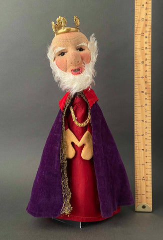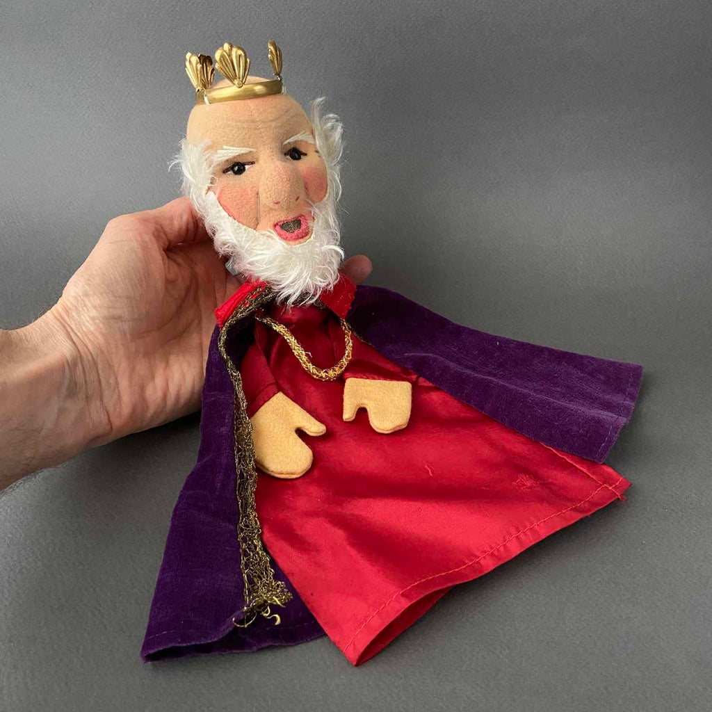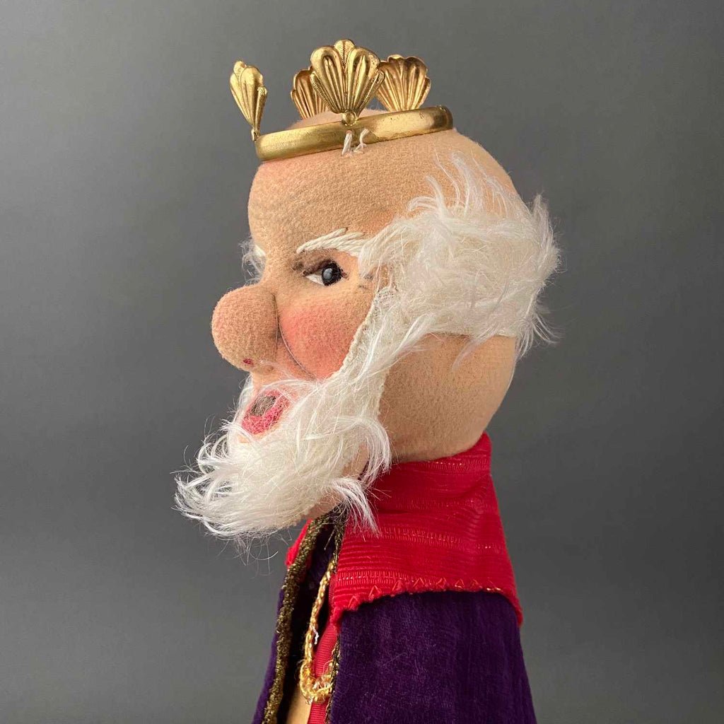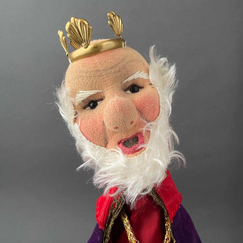 Founded in 1925, KERSA is Europe's leading hand puppet maker. Crafting puppets has been a family tradition over four generations and the company is still in production today. KERSA stands for "Kreative Erzeugnisse Realisiert im Spielwaren Atelier", a German phrase that conveys their main vision: to create products in an artistic manner while promoting the children's imagination. This King Hand Puppet is an example of Kersa's amazing craftsmanship and was made in Mindelheim, Germany, circa 1960s. His fairy tale expression, with mohair beard, plastic eyes and hand stitched features, is adorable. His body is made of fabric with detailed felt hands. He wears a velvet-like cape and a metal crown. The head is stuffed with soft material and has a cardboard finger tube for movement. Little King can't wait to join your royal vintage toy collection!