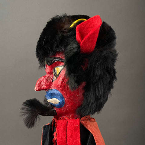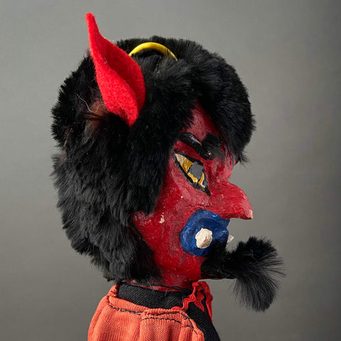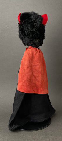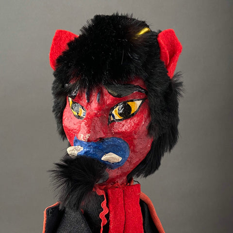 Here's a vintage DEVIL Hand Puppet full of personality. This toy comes from a set of papier mâché hand puppets crafted in Germany circa 1960s. It features a carefully hand painted head with lovely fabric costume. Little Devil is about 13.5 inches (34cm) tall and was likely made for children's play. This puppet was never used but shows paint loss on the head and other signs of age and wear. A delightful vintage hand made puppet ready to join your toy collection!