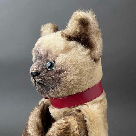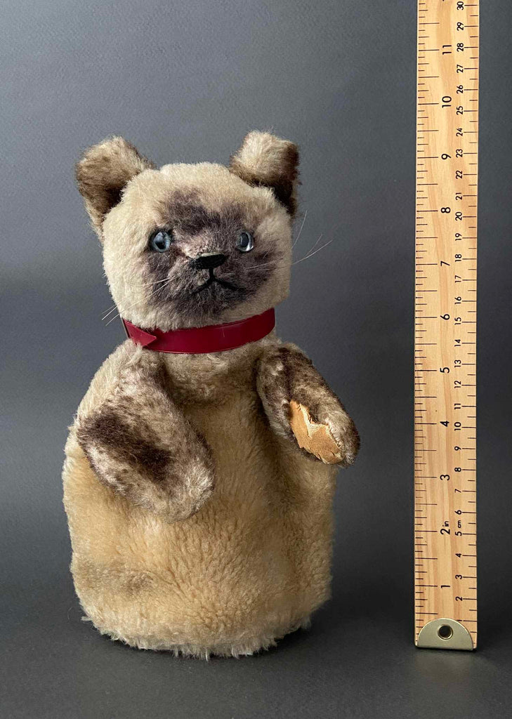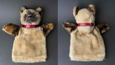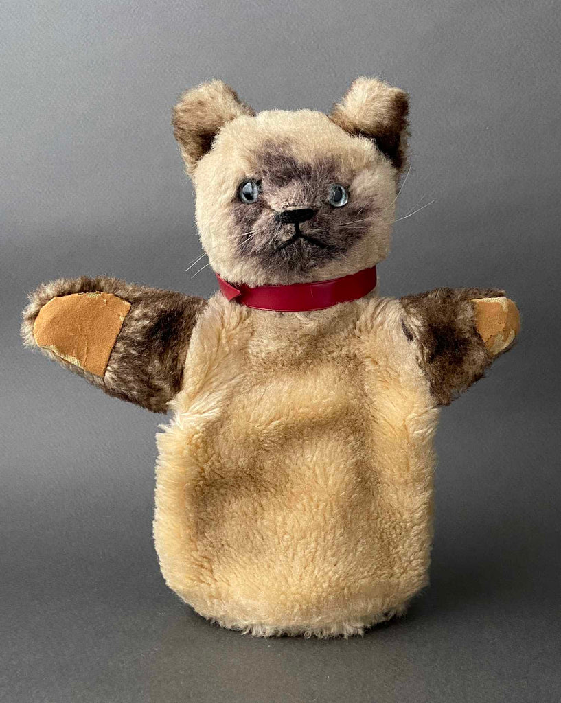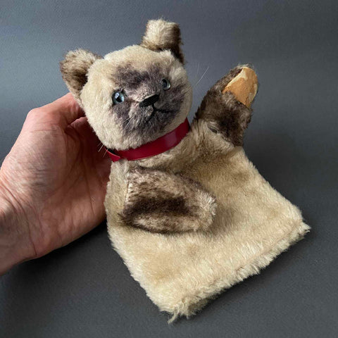 One of the leading English Teddy Bear manufacturers, Alpha Farnell became a trademark in 1925 and produced wonderful soft toys up to 1960s, when it ceased production. It's believed that one of the Alpha Bears inspired the creation of Winnie the Pooh. This beautiful Siamese Cat Hand Puppet is a visual testament to Farnell's beauty! Carefully crafted from wool plush with hand-stitched nose and endearing glass eyes, this charming piece is a must for toy collectors. Its head is stuffed with excelsior (wood wool). It has a red plastic collar and worn rexine paw pads. No marker's label. Used vintage condition with a great deal of charm and personality. Little Kitty hand puppet will be a great addition to your vintage toy collection!