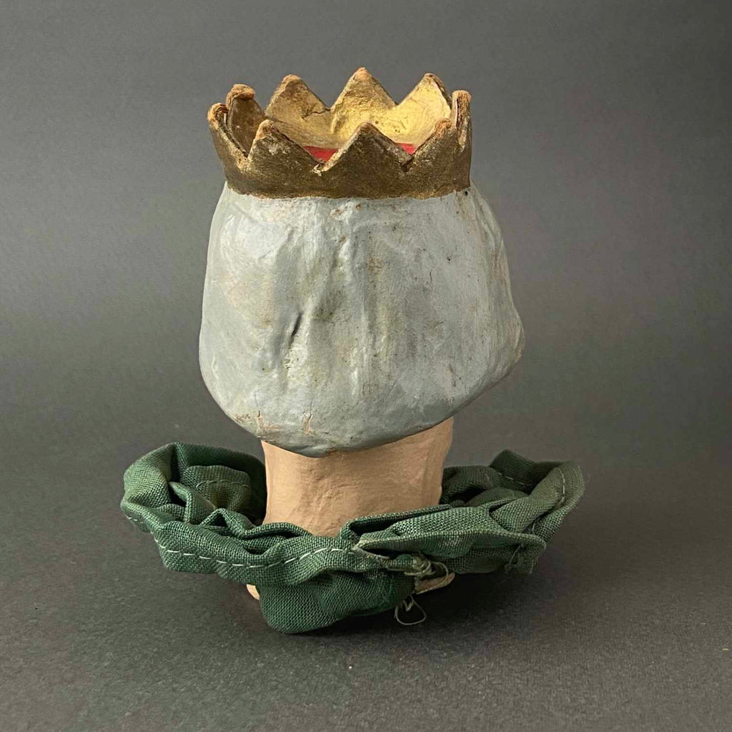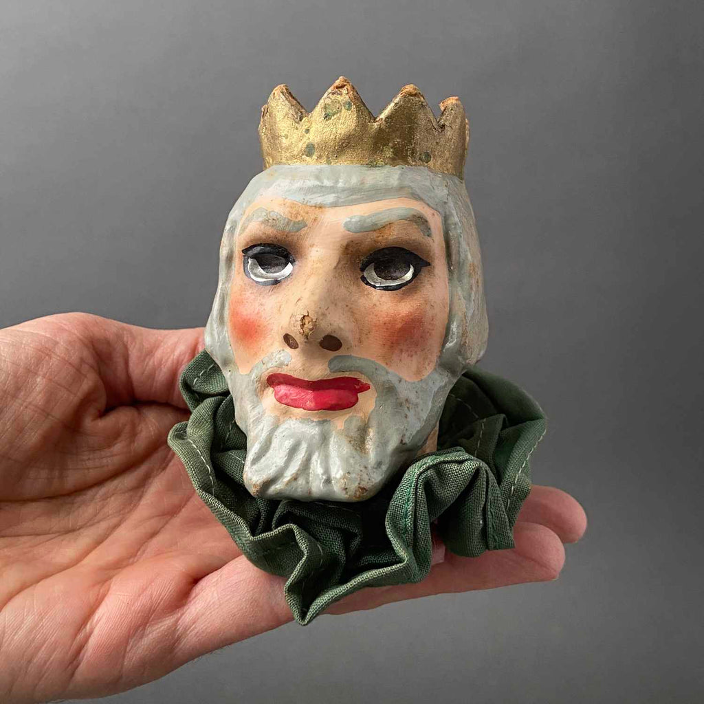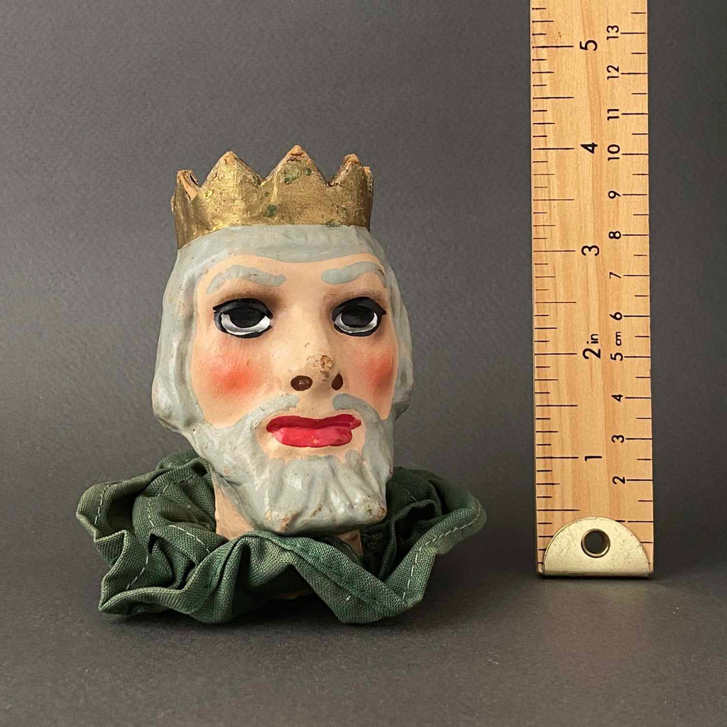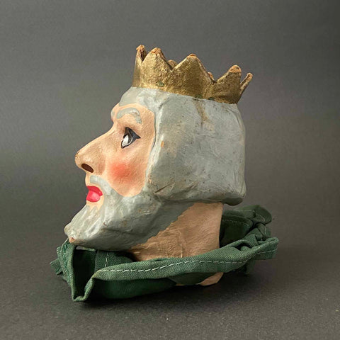 Here's a beautiful puppet head of a King character. This piece was finely handcrafted in Germany circa 1960s. The head is made from paper mache and has an amazing expression. A silver-like paint was used in the eyes making them even more striking and unique. It works nicely as a stand alone small vintage head or it can be your next vintage DIY puppet project. This great piece of craftsmanship will certainly be a special addition to your vintage collection.