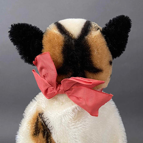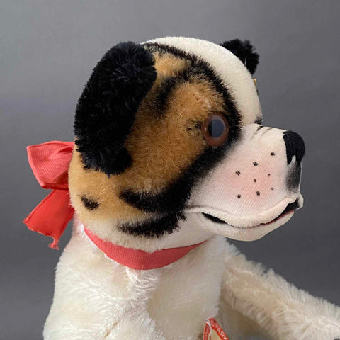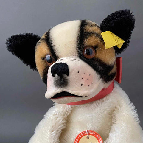 Steiff, the legendary German plush toy company, is famous for its artistry, beauty, and lasting quality. They produced amazing dogs of every breed and Bully the bulldog as a hand puppet is guaranteed fun! And this Bully is even more special because it's complete with all tags and in excellent unused condition. This model was handcrafted in Germany between 1959-63. His expressive large glass eyes and hand-stitched nose with an elaborate velveteen muzzle, give him an unmistakable look that is both grumpy and endearing. Steiff uses the nicest mohair plush and the airbrushing work on this puppet is also remarkable. His head is stuffed with excelsior (wood wool) and has a cardboard finger tube for movement. No doubt this rare little puppet will be a great addition to your vintage toy collection!