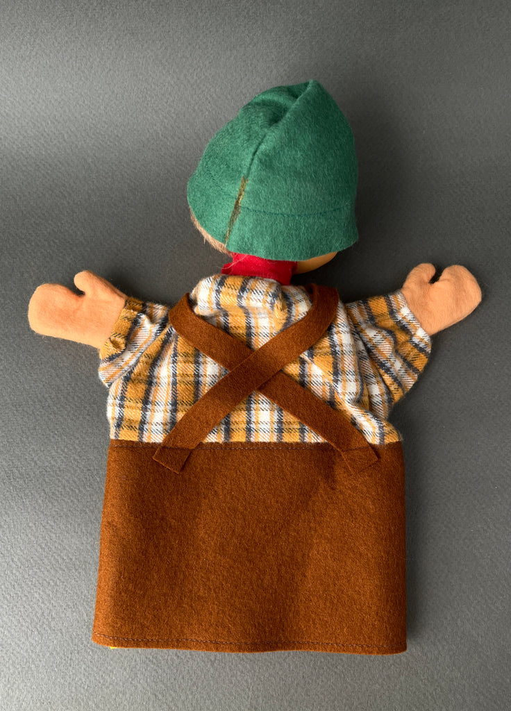 Steiff, the legendary German plush toy company, is famous for its artistry, beauty, and lasting quality. They produced amazing stuffed animals of every type, including super fun hand puppets as part of the novelty human characters with PVC heads introduced during the 60-80s. This expressive Steiff Hansel hand puppet was produced between 1969-78. Similar to other toys of the time it was finely handcrafted in Germany. He wears a traditional costume with a flannel shirt. His hands and hat are felt. His hands are made from felt and his head is made from painted PVC. Little Hansel Boy is gently used and retains his Steiff button and yellow tag #7075/17. This charming character can't wait to join your toy collection!