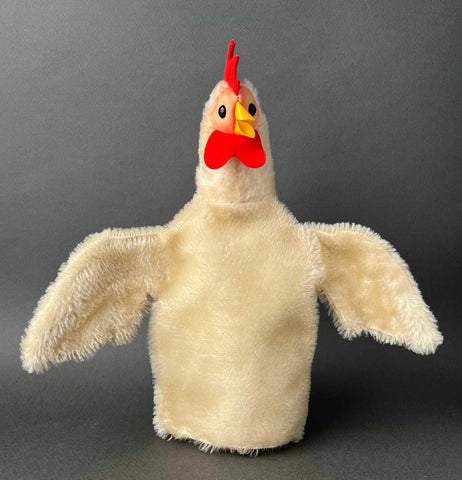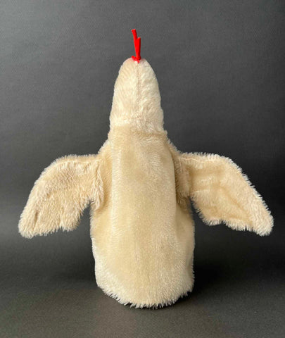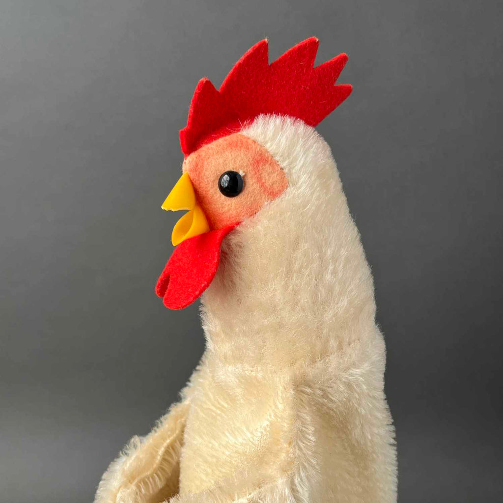 Steiff, the legendary German plush toy company, is famous for its artistry, beauty, and lasting quality. They produced incredible stuffed animals of every type, including super fun hand puppets, like this Hen character, a great example of a bird that is rarely seen as a plush toy. This puppet was finely handcrafted in Germany between 1968-74, a relatively short production time. Its felt comb, plastic beak and flapping mohair wings are adorable. Its head is stuffed with excelsior (wood wool) and has a plastic finger tube for movement. This puppet is overall in good condition with nice and bright mohair but please note that there's some damage to the plastic beak and a small tear to the felt comb. All Steiff IDs were lost to time. This playful little bird can't wait to join your vintage toy collection!