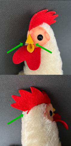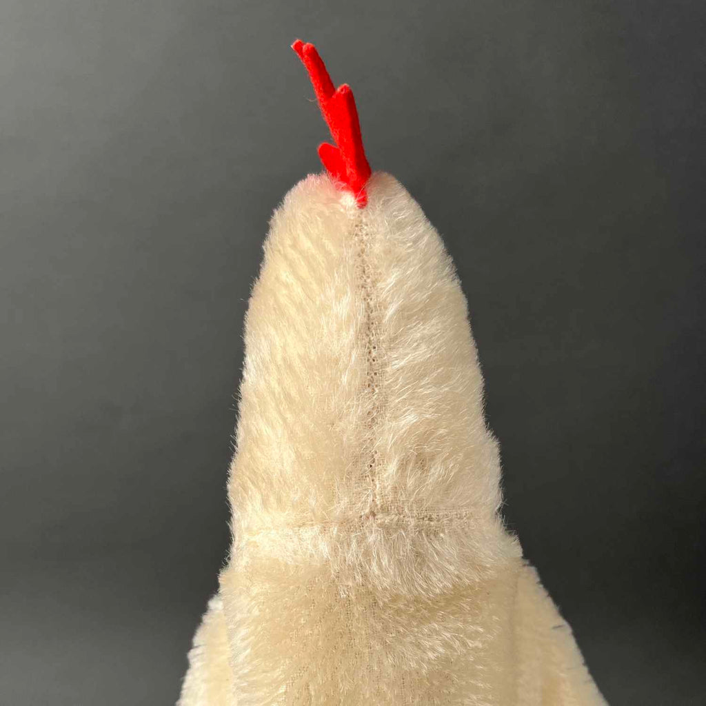 - Condition: Used and pre-owned vintage puppet. Nice and bright mohair. Damage to the plastic beak and a small tear to the felt comb. Missing Steiff IDs. Please determine the condition by yourself, taking a close look at all pictures and asking questions.
