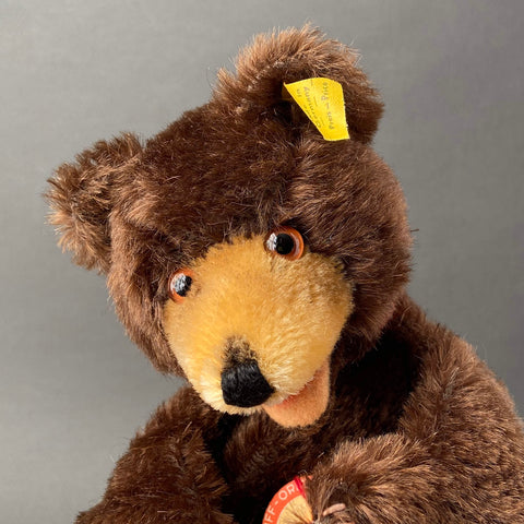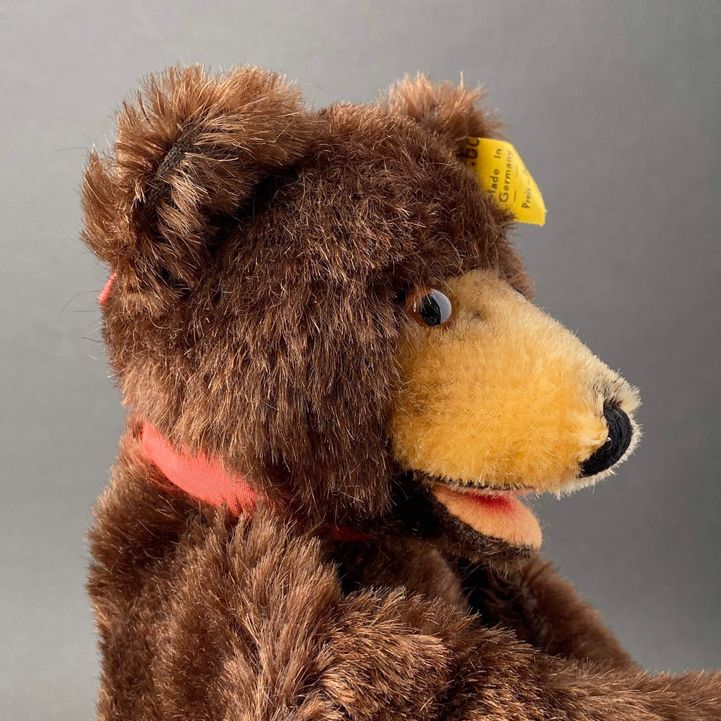 Steiff, the legendary German plush toy company, is famous for its artistry, beauty, and lasting quality. They're renowned for creating the original Teddy Bear and everyone is enchanted when the iconic Teddy comes to life as a hand puppet. This toy comes complete with all IDs, plus an adorable "Teddy Baby" chest tag, which is quite rare. Expertly crafted in Germany using premium mohair plush, this cute puppet dates back to 1959-1967 and showcases a very expressive face with glass eyes and an open felt mouth. Teddy has been gently used and still keep sharp tags. His head is filled with excelsior (wood wool) and has a cardboard finger tube for movement. Treat yourself to this special vintage treasure today and add Teddy hand puppet to your toy collection!