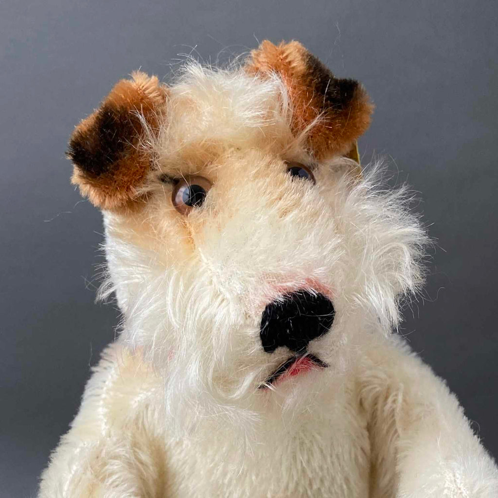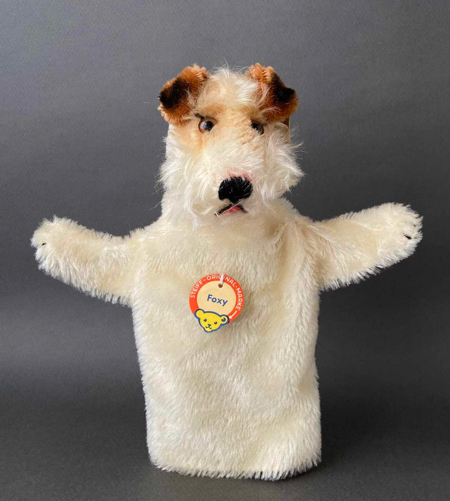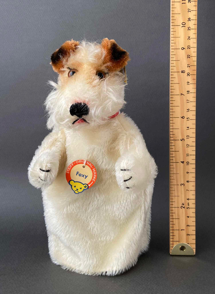 Steiff, the legendary German plush toy company, is famous for its artistry, beauty, and lasting quality. They produced amazing stuffed animals of every type, including super fun hand puppets. And this Fox Terrier named Foxy is even more special because it's complete with all tags and in excellent unused condition. This beloved little character has an endearing expression due to its glass eyes. Foxy was finely handcrafted in Germany between 1959-67 and uses the finest mohair plush. The coloring is still vibrant. It has a hand stitched nose, mouth and claws. Its head is stuffed with excelsior (wood wool) and has a cardboard finger tube for movement. This charming Terrier puppet can't wait to join your vintage toy collection!