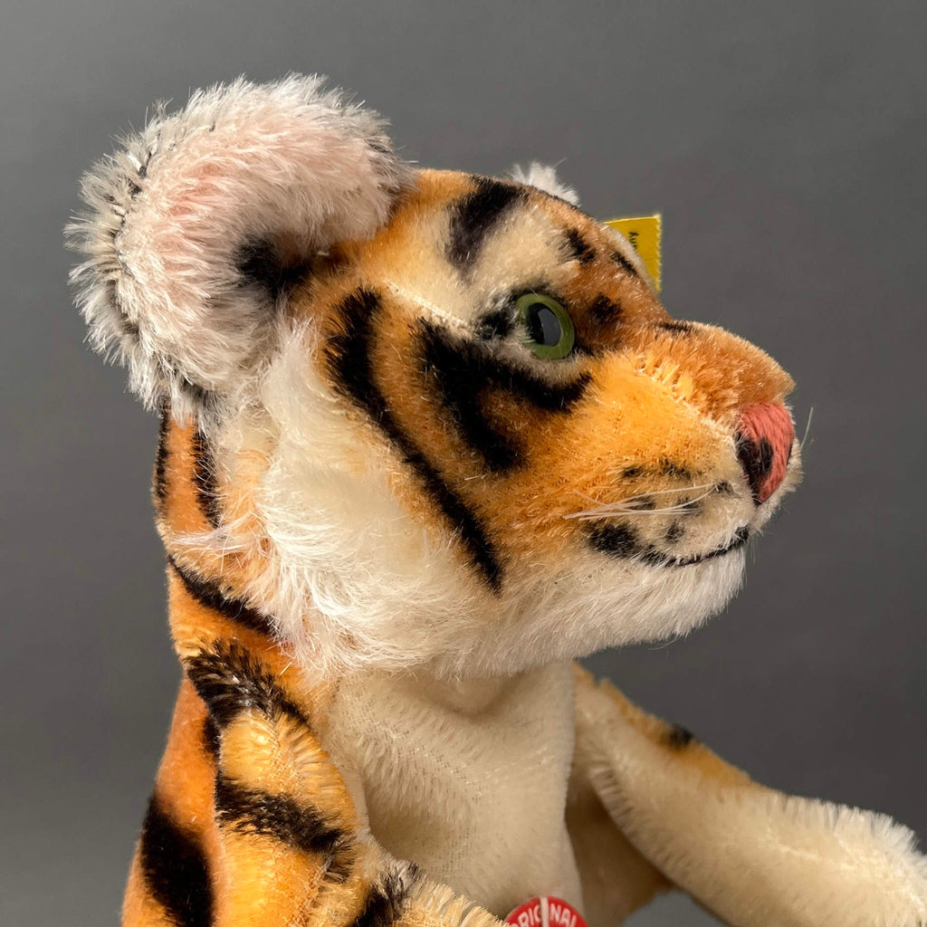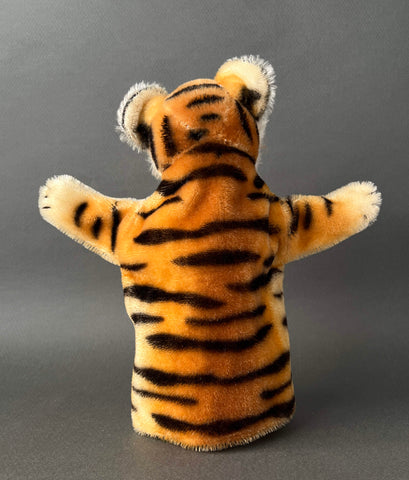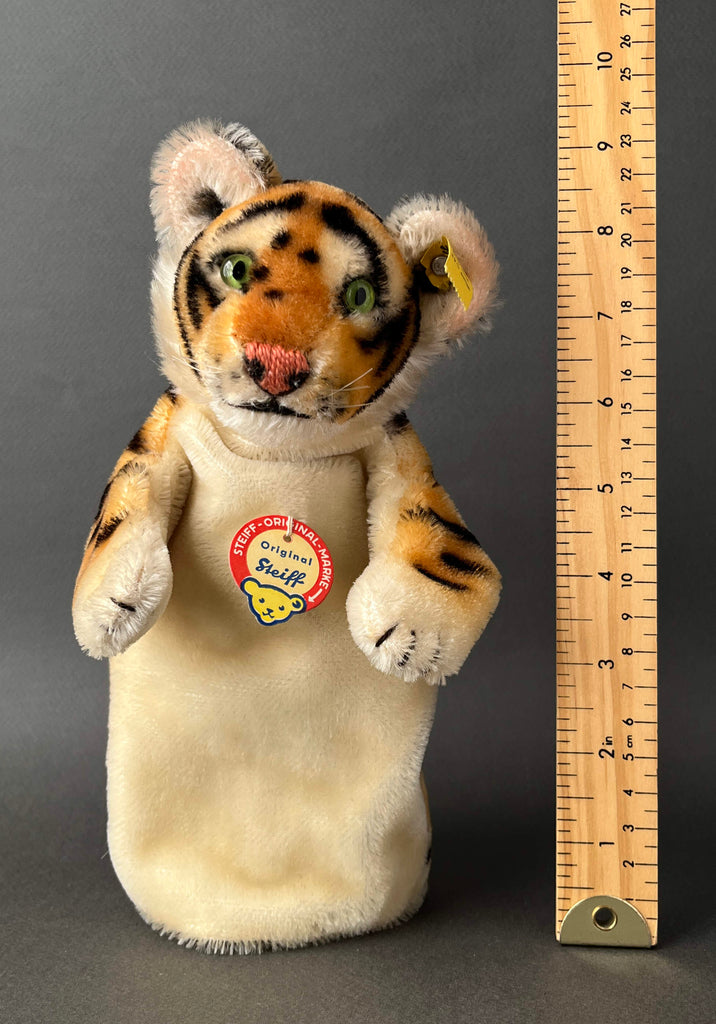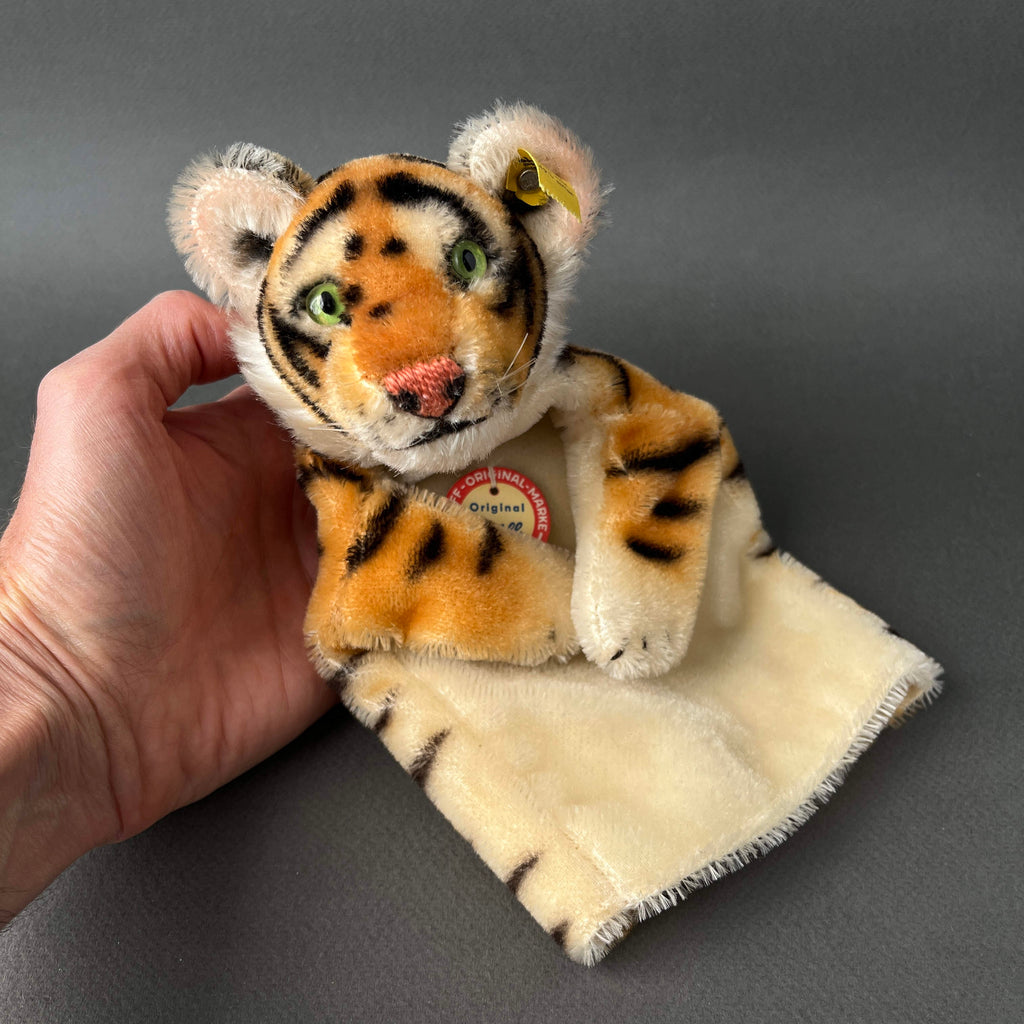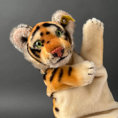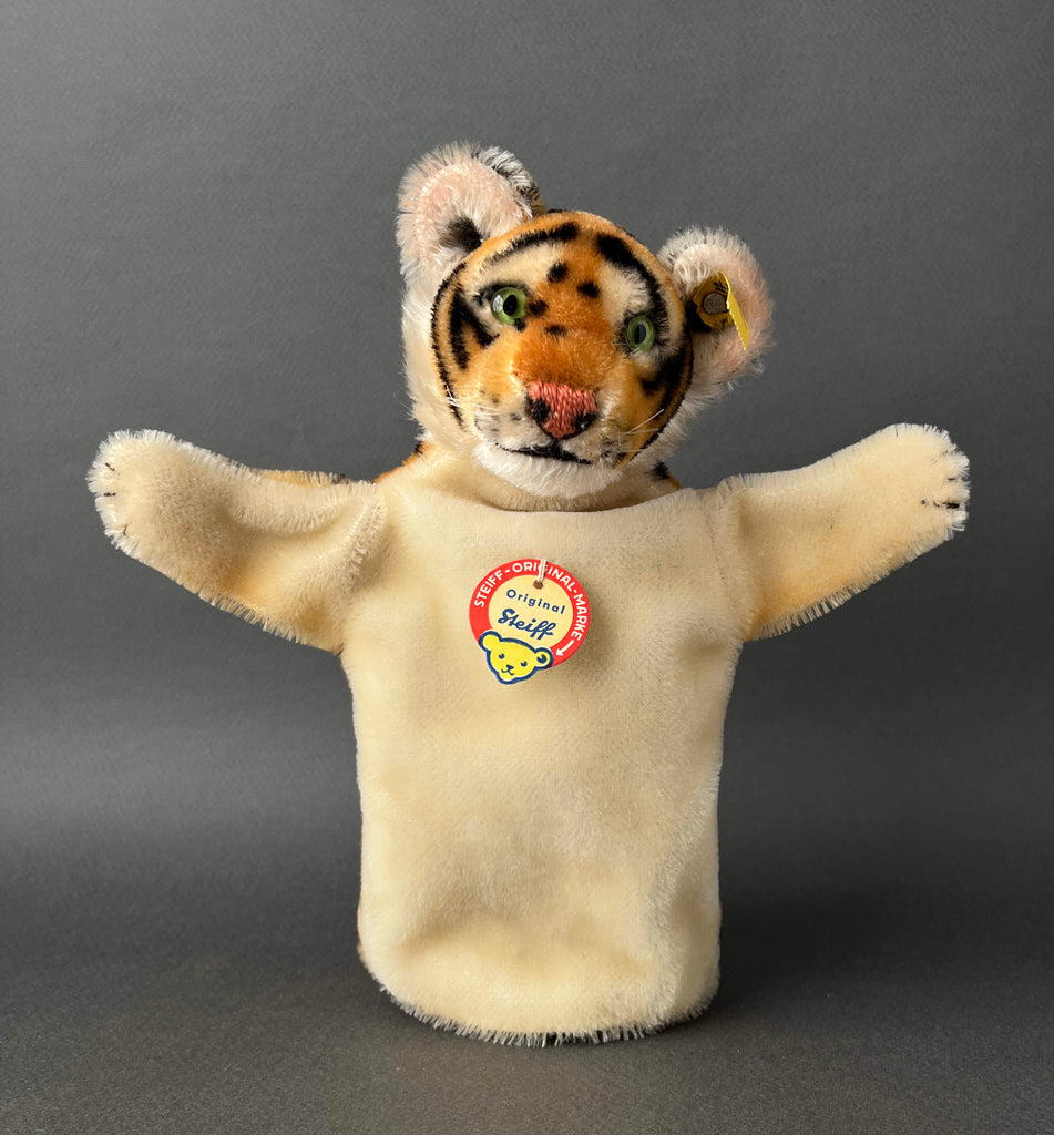 Steiff, the legendary German plush toy company, is famous for its artistry, beauty, and lasting quality. The company produced amazing stuffed animals of every type, including super fun hand puppets. And this Tiger puppet is even more special because it is an early model #317 and retains all its IDs with crisp tags. The coloring is vibrant and it is in mint condition. As other vintage Steiff toys, it was expertly handmade in Germany from 1952 to 1958 using the finest mohair plush. The amazing airbrushing work gives this character a vibrant and eye-catching appearance that everyone loves. It has endearing glass eyes, embroidered nose and mouth, and nylon whiskers. Its head is stuffed with excelsior (wood wool) and has a cardboard finger tube for movement. Little tiger hand puppet can't wait to be a special part of your vintage toy collection!