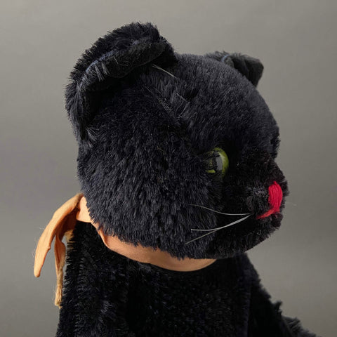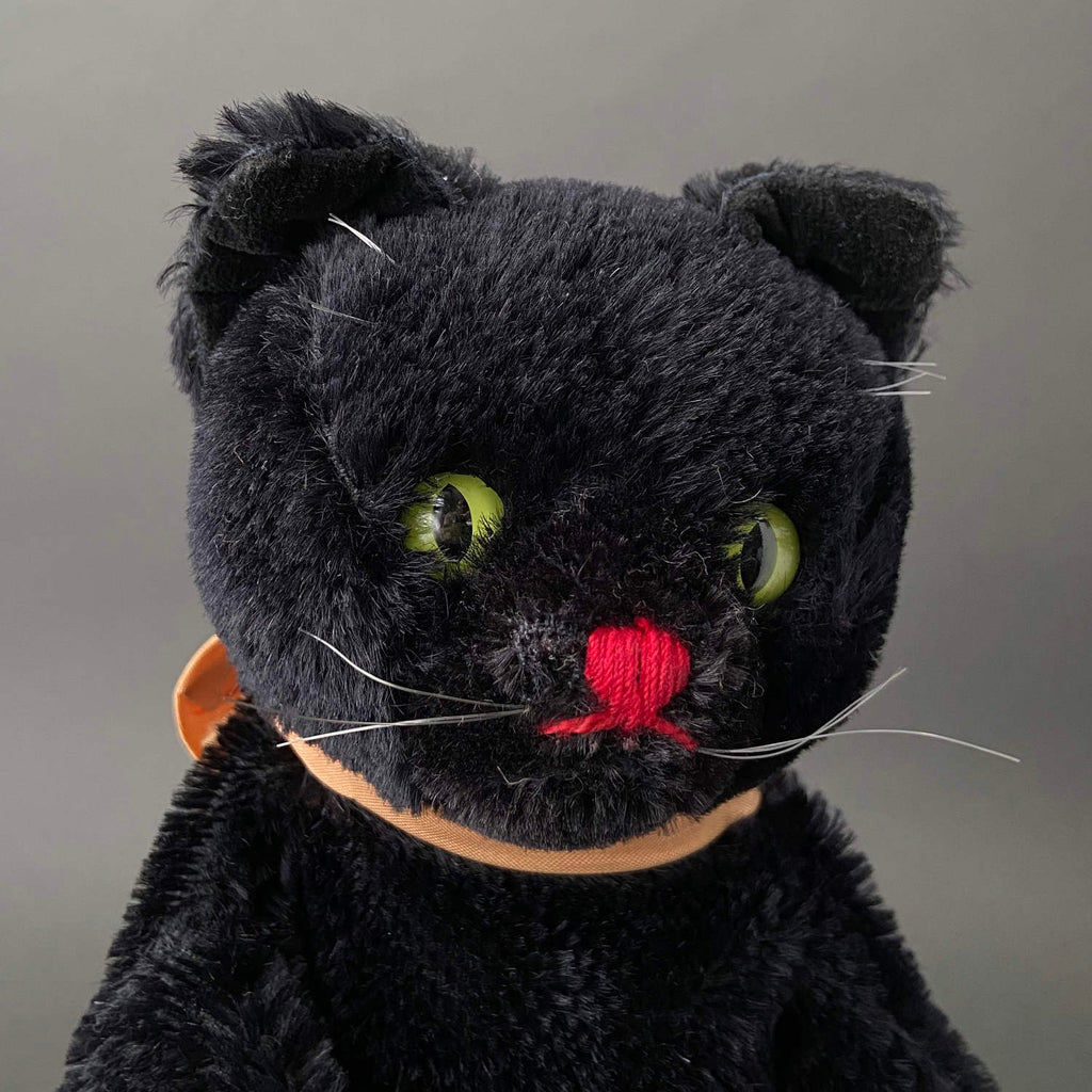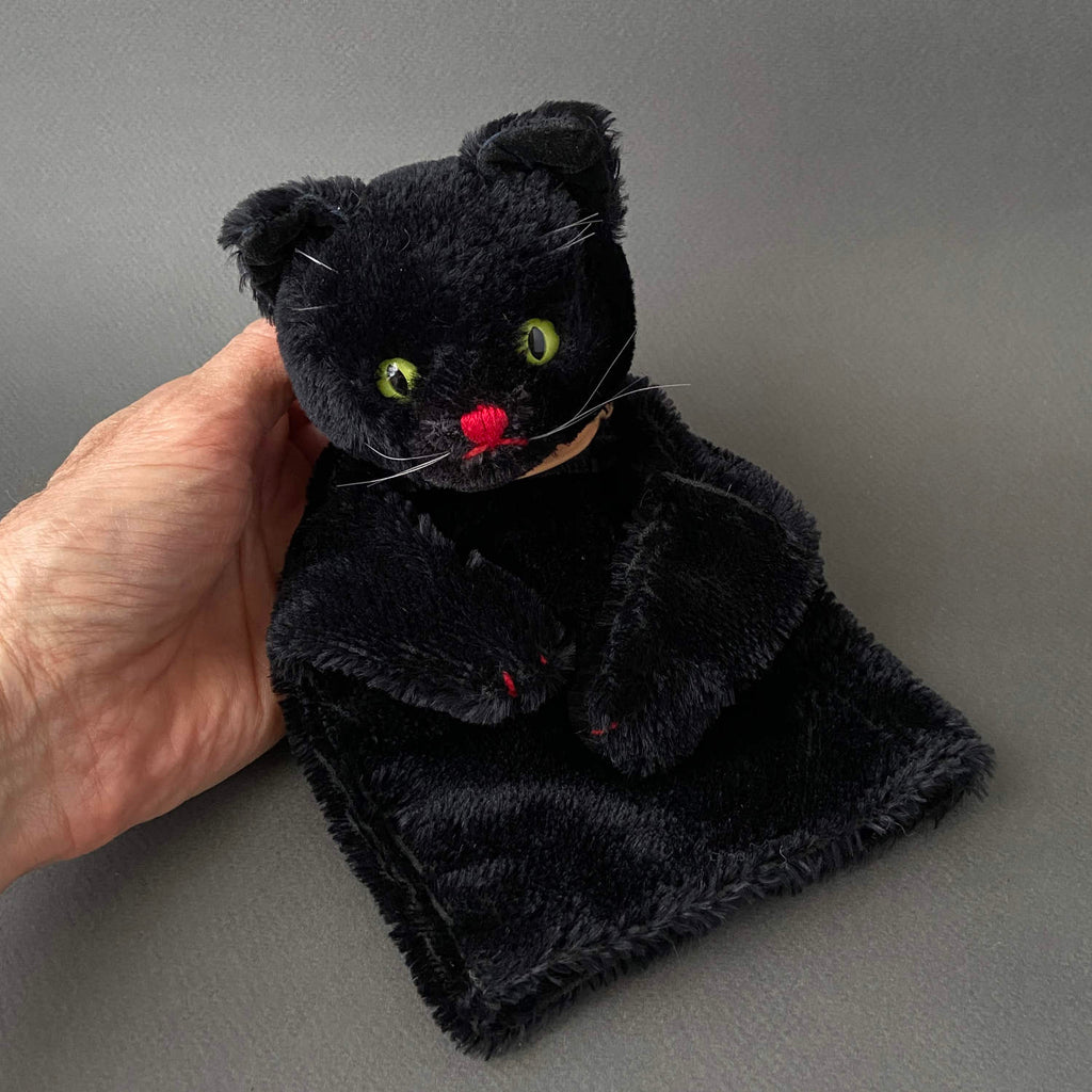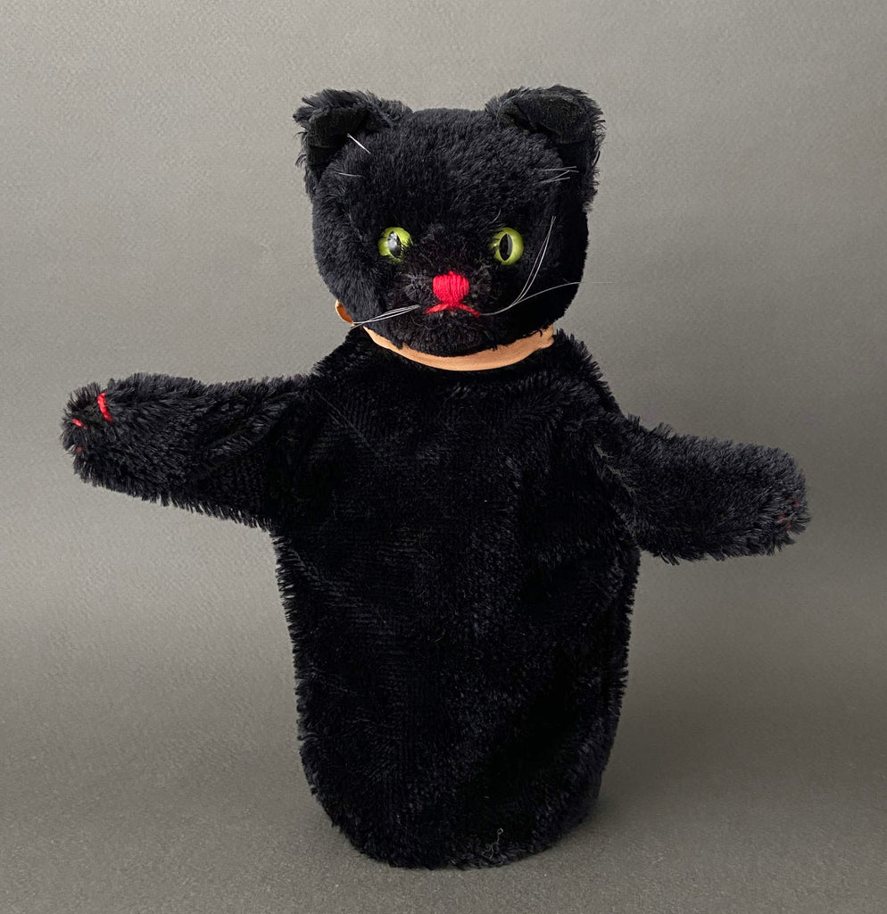 Steiff, the legendary German plush toy company, is famous for its artistry, beauty, and lasting quality. They produced incredible stuffed animals of every type, including super fun hand puppets, like this adorable Tom Cat, a favorite among Steiff's beloved felines. This Kitty's expression with green plastic eyes is hard to resist. Like other toys of the time, Tom Cat was skilfully handcrafted in Germany circa 1970s using the finest mohair plush. The pictures can't capture how lustrous its plush is. Tom Cat has nylon whiskers and stitched nose/mouth. Its head is stuffed with excelsior (wood wool) and has a plastic finger tube for movement. Tom Cat has been used and shows age and play wear. No Steiff IDs are present. This sweet little puppet can't wait to join your vintage toy collection!